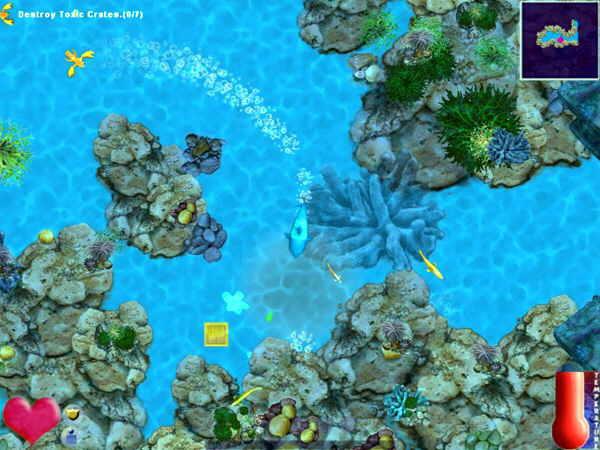 Finlay the hero begins each stage with at least one mission to accomplish, usually consisting of a quest to destroy crates leaking pollutants into the water or neutralizing other manic sea creatures who have become infected by said toxic sludge. As in all RPGs, you’ll earn credits for acquiring treasure and completing objectives that you can then spend on upgrading your offensive or defensive aptitudes and capabilities.