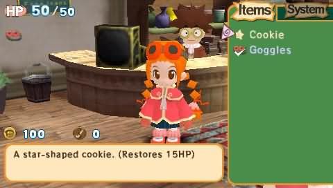 There are a few RPG properties in Gurumin. Aside from the traditional health and energy restoring items, you are able to equip Parin with a number of outfits and accessories, bought with tokens. You will begin with the Goggles, which reduce water damage. But as you collect junk from defeating monsters, you can purchase upgrades for every item. For example, the Goggles on level 2 block all water damage, so you are free to swim without worrying about your health. But there are several useful items that will make your adventure easier, and none of them becomes obsolete, since you will use them according to different situations. A Gask Mask to prevent poisoning, a Bandana that increases damage, Cat Ears that help detect chests, a Ribbon that halves trap damage, and a Vampire Kit that restores HP through critical attacks are some of the items you will find. All of these will be visible on Parin when equipped, and some make her look even more adorable than she already is.