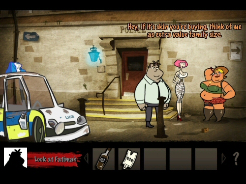 Sure enough, you can go around clicking on everything to see what you can interact with or pick up, or combine random things in your inventory to find out what works, but there are times where inspecting your inventory carefully and thinking a little will prove helpful. I found that a few times I was thinking of creative solutions for certain things without having all the items I would need, and one of the best moments was when I realized that the heroine addict in the park was sleeping in a sex doll box, and that I would actually need him to accomplish my goals. Yes, there is a hint system, which is basically your partner Lambert, but he is never very helpful and always gives you extremely vague instructions.
