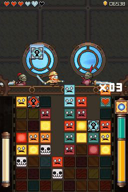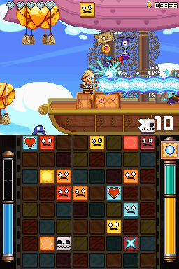 The top screen houses the Mario-esque platforming, which sees Henry jumping over gaps and scaling large platforms while defeating monsters with the help of his trusty pistol and saber, while the touch screen is home to a match-three puzzle game that is affected by your top-screen actions in real time, whether you are physically interacting with it or not, by morphing the “spirits,” if you will, of fallen enemies into blocks on the puzzle grid, or by allowing you to activate power-up blocks, like lightning bolts, that can attack enemies back on the top screen.