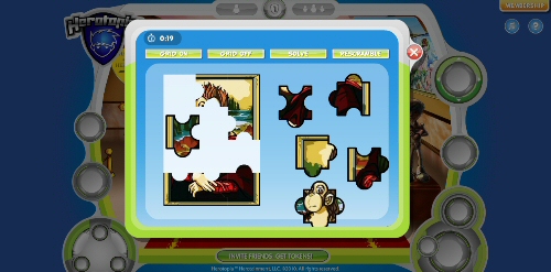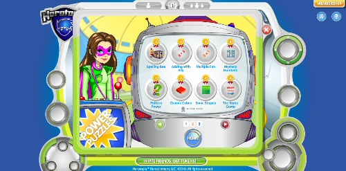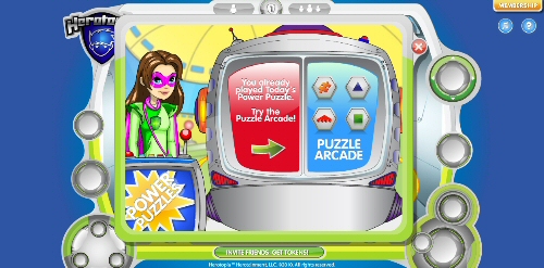 The available games are not just mindless tasks, but activities that encourage thinking and self-expression. There are coloring scenes, jigsaw puzzles, geography challenges, object finders, a Jeopardy-like trivia game, snowball fights and more waiting to be found. In the Hero Hideout there is a special section for games called Power Puzzles where you can find the daily Power Puzzle and the Puzzle Arcade. The Power Puzzle is a challenge composed of random tasks you can find in the Puzzle Arcade. The Puzzle Arcade is a compilation of mini-games where you can find spelling checks, shape recognition tasks, math operations, jigsaw puzzles, crossword challenges, telling time challenges and trivia questions.