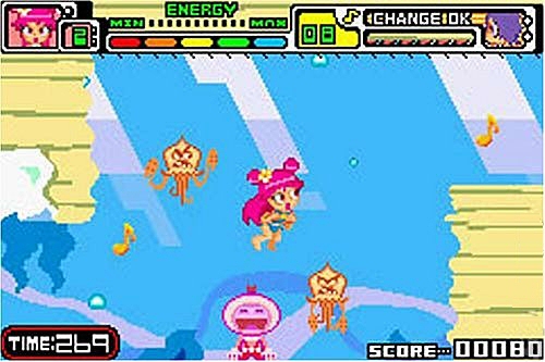 Gameplay is split between a side-scrolling platformer and a side-scrolling shooter. In the platform levels, you have to progress by solving environmental puzzles such as breaking certain blocks, pushing other blocks and activating switches. You switch between Ami and Yumi according to what you need to do. Ami can triple jump to reach higher grounds, she can use her microphone to swing on hooks and she attacks with her mic as well. Yumi uses her guitar to activate switches and break certain blocks, and she is strong enough to push or pull other blocks out of the way. She attacks with her guitar and has a cool air gliding attack.