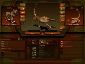 Combining animals to create these genetic monstrosities is the guts of this game. Not only do you have to pick the two animals you want to combine, but you also have to choose which body parts will be from which animal in the end product. Each body part from each animal has certain stats and/or abilities. They also contribute to the cost of the creature and the Research Level your lab has to be at in order to make the creature). Attack abilities tend to come from the head, forequarters, or tail parts. Sometimes special attacks come from other parts of the body as well; you just have to play with it a bit. The only confusing thing about the creature generation interface is the way it compares stats when you are flipping between different body parts, animals, etc. You’ll see green and red numbers, representing pluses and minuses to your choices. For example, if you are trying to decide whether to use a cheetah’s or a scorpion’s head, look at the numbers when you click on the head button on either side of the animal (if you click on the same head button twice, it will flip back and forth between animal heads). A cheetah head brings the coal cost down a bit, and its scouting radius is higher, but the melee damage is lower and health and defense are slightly lower as well. You have to balance these tradeoffs in order to create the perfect creature. Sometimes it is difficult to see where the difference lies – if this is the case, make sure you look at the attacks and abilities (on the left and right sides of the screen), which will light up when chosen, and dim out when not. When you are trying to select animals to combine, take note of each one’s special abilities. Of course, the more abilities, the more expensive the resulting creature will be.