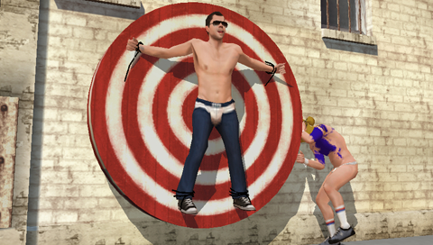 Party Boy is probably my favorite, so I’ll start there. Here you play Chris Pontius as the crazy stripper dude who dances all over the place wearing nothing but his thong and sometimes a little bow tie. The game is rhythm-based, and as the music goes on, buttons will appear scrolling from left to right. You must press the correct buttons as they pass through the circle. The longer you manage to keep playing, the more complicated the combos will be, mixing d-pad directions with any of the buttons, and the better your score.