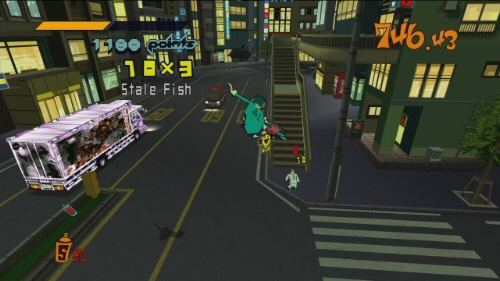 You play as Beat, a 15 year old rudie who decided to start his own gang: the GG’s (Graffiti Gangsters). Initially, two other rudies will send you on a series of challenges to test your skills and to let you get acquainted with the controls. After the “tutorial in disguise”, Gum and Tab become the next members of your gang. Soon enough you will have to face the challenges of several other rudies, always of increasing difficulty, testing your speed and tag skills as you skate through the different districts.