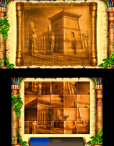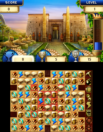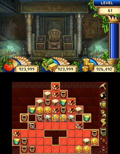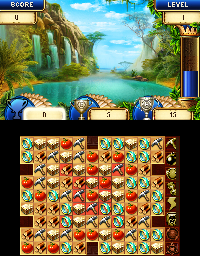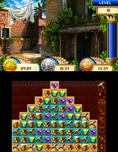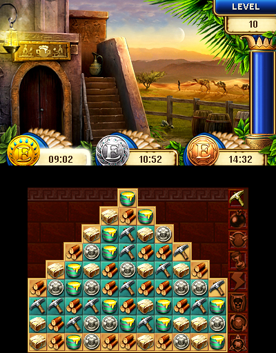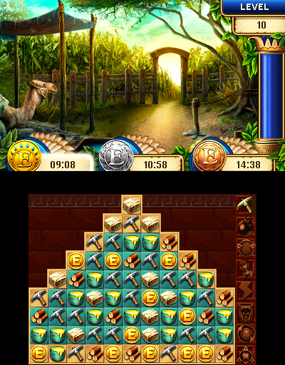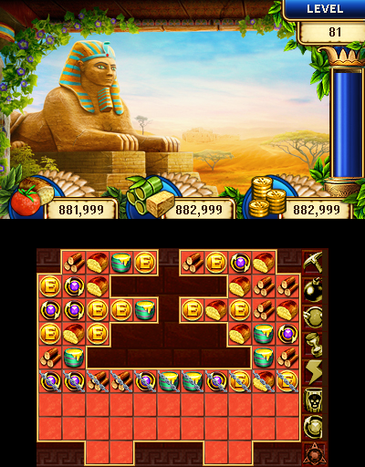On the top screen you can see an overview of how many of each supply you currently have, the current landscape of your civilization and the timer column during a puzzle. You can turn the 3D effect on to see the depth in the landscape, as well as in the scenes that appear as you play each puzzle. It’s a very nice added touch and the art is quite beautiful, but our attention remains on the touch screen most of the time.
