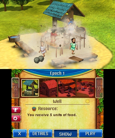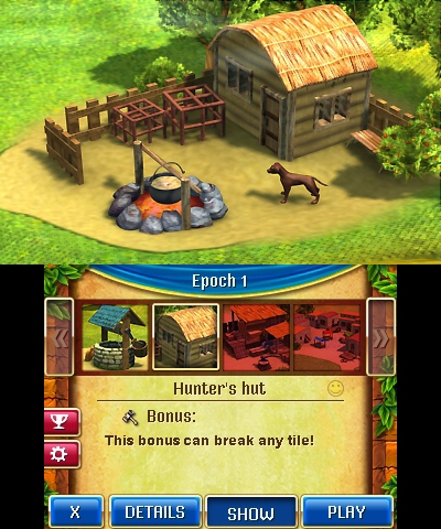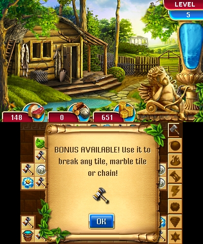 Each type of tile corresponds to either one of eight power-ups or a building resource (food, wood/stone or gold). Power-ups may allow you to remove a single tile or blow up whole sections of the board (as examples), but you’ll need to play dozens of levels before unlocking more for your use. Back in the village itself, you’ll use the aforementioned resources to construct buildings, but there’s unfortunately a dull tile-sliding mini-game presented before each.
