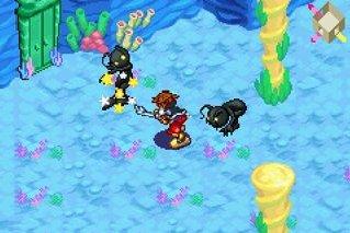 The opening sequences are very nicely done and for a small handheld like the Gameboy Advance it’s quite an achievement to have that level of detail in animation appear on the tiny screen. As the story begins, you find out that Sora, the main character, is at some kind of crossroads… literally. I mean they actually have him standing in a field in an intersection of two roads. Talk about metaphors that hit you on the head with their points! A large castle looms ahead and you get the idea that there’s something fishy going on. So of course Sora joins in!