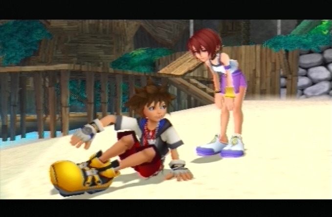 There are also some silly games at the beginning of the game during Sora’s dream sequence where you actually customize your level of game play. In one scene, you are presented with a sword, mage’s staff, and a shield. You are to pick one, and discard another. Basically, this determines your starting statistics, which is important at the beginning of the game, but then not so much as you gain more levels. For beginners, I would suggest picking the sword and keeping the shield, as at the beginning of the game, magic is not as much of a factor. Also, magic is somewhat difficult and awkward to use. In the real time battle, casting spells is not immediate. Sora pauses a little bit while casting, which may allow an enemy to strike you while you are vulnerable. Also, you need to get used to using the left directional pad to select magic spells, which can get very annoying if you are used to using the pad to move around (rather than using the analog stick). Fortunately there is a shortcut where you can assign spells to a key combination of L1 and one of three right-hand buttons, but this is also somewhat awkward, especially if you assign a spell to the “x” button as you are attacking something (also with the “x” button). Another silly beginning game will also determine how fast you level. I’m not sure why someone would not want to level as fast as possible, but I guess there are some secrets to the game we don’t know about yet…. This dream sequence is generally a way to familiarize with the controls of the game, game battle, and also provides a little insight into the storyline (which, at this point, is not very much).