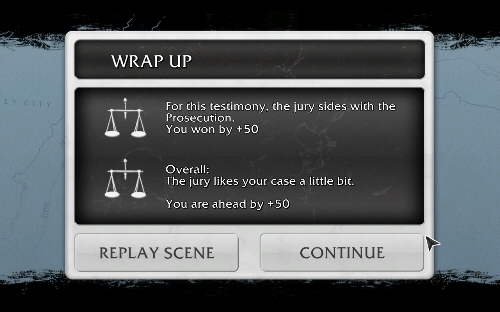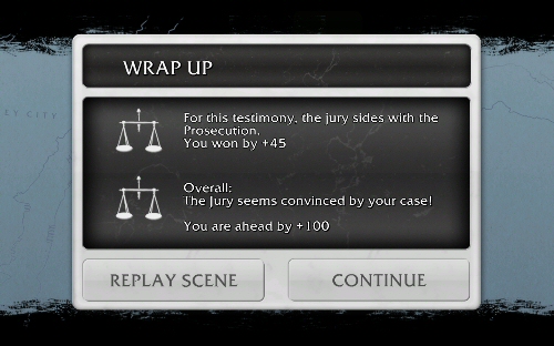 The meter will show you if the jury is siding with you or with the Defense. The more points you earn, the more likely the jury is to make a conviction, and the more power you will have when it comes down to plea bargain.