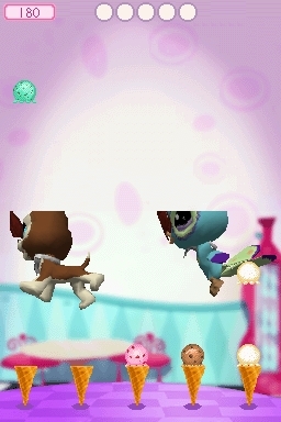 As specific examples, one game has you collecting falling scoops of ice cream on moveable cones, while another has you catching falling toys in like buckets. On the other side of the token, you have a shuffleboard inspired mini-game that asks you to slide the appropriate candy to the top screen, landing as close to the center of a target as possible, along with a standard take on Skee-ball.