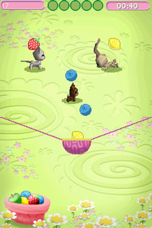 “Fruit Fling” continues the nutritional vibe by allowing some of your pets (the higher difficulty level you choose, the more pets) to wander around the top screen accompanied by pictures of fruit that symbolize their favorite one. A slingshot at the bottom of the screen allows you to fling random pieces of fruit to the appropriate pet, which is easier said than done, due to the disorienting gap caused by the separation of the two screens.