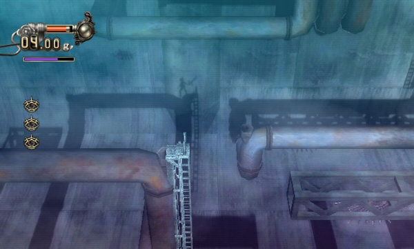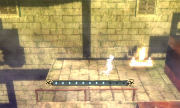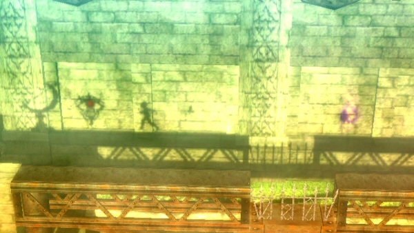 I navigated my shadow through an outdoor area and an indoor area. The bright and somewhat hazy outdoors look clashed with the dull and dark aspect of the tower, which was by far more dangerous. There was a chase with a mass of shadows that had arms and legs reaching out for me, as I ran and jumped through the platforms, hitting certain items to cause flashes of light to slow it down, jumped over moving saws, climbed on wind vents and slashed at other shadowy foes. I have to say I quite liked it!