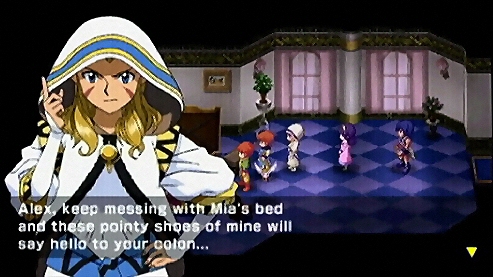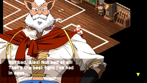 Anyway, in this new lengthy intro, you are taken into some past event where the four heroes defeat some evil dude, save the goddess Althena and a prophecy is made. This just to skip to Alex being told this story by his parents, in his little house in Burg.