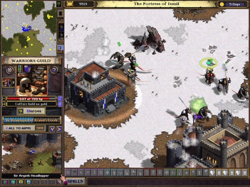 Other than combat, there is an important element of commerce to the game. After all, you do need money to run the kingdom. You can obtain gold from collecting taxes from buildings that generate gold. Sometimes there are treasure chests on the map, which your thieves are quick to spot and loot. Some creature lairs also contain gold for looting. Most creatures also have a certain worth, which gets split between all the units involved in fighting the creature when it dies. Units will bring the gold back to their guild, a portion of which gets collected by the tax collector, or gets spent in commerce-specific buildings, which often have goods (weapons, armor, magic potions, etc.) that your units will buy with their hard-earned cash. By the way, it is in your best interest to keep an eye on the tax collector, because he is vulnerable to attack. The tax collector generally brings gold back to the castle, but you should build some guardhouses around your kingdom, because not only do they generate guards to protect your buildings, but they also provide a place for tax collectors to deposit money from more remote locations.