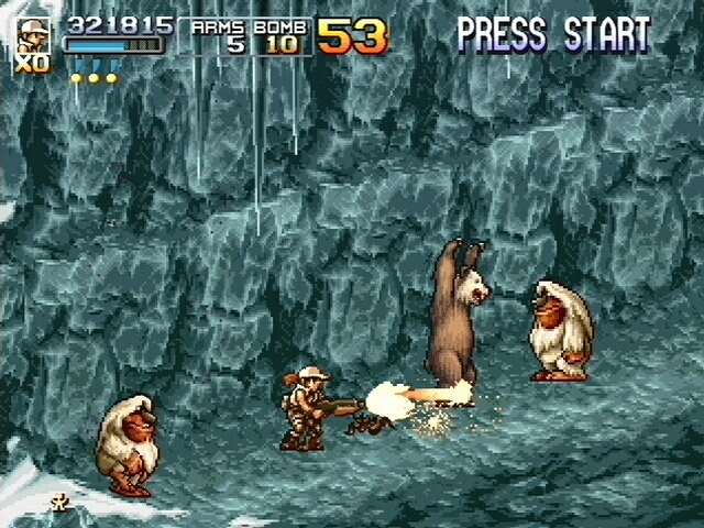 After playing Metal Slug 3 and ending up disappointed with it, picking up Metal Slug 4 & 5 took me a while. I was afraid the game would suffer from the same problem as the previous installment: every time we died, we went back to the beginning of the stage. Pretty frustrating, if you ask me. Fortunately, Metal Slug 4 & 5 didn’t have this problem. Continuing resumes your position exactly where you died.