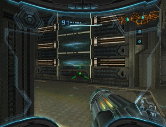 You begin the game with an arm cannon and Scan Visor, but will soon find other weapon upgrades, different visors and other gadgets. The new Lock-on Free Aiming targeting system allows you to lock on an enemy by pressing the Z button on the Nunchuk, but still aim freely and look around your surroundings with the Wii-mote.