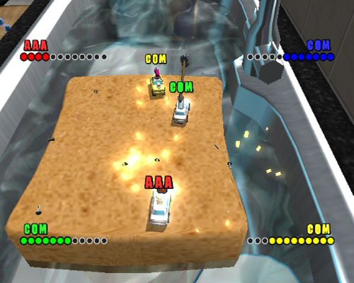 If possible, children and small animals would scream about the perils of household objects. A stray Monopoly board, rolling pin or rock could mean the difference between a merry skip or a sudden tumble. But since they have no voice in which to describe the world of being small, it’s up to adults to create the picture for the remaining and uncomprehending big. Enter the surreal itty-bitty universe of the Micro Machines top down racing franchise and its latest instalment. But is it a lethargic lope on a pane of safety plastic, or a raucous romp through road works?