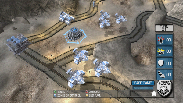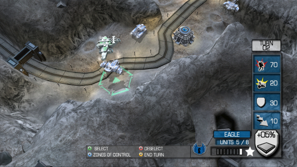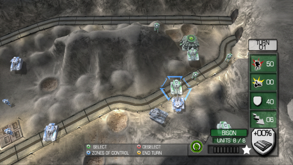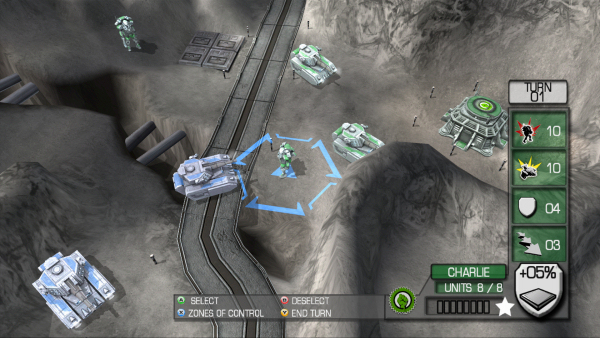 Each of the game’s maps is viewed from above, and split into a hexagonal grid. Your cursor moves throughout the environment via the D-pad, and with a few simple taps of A, your individual units are sent into battle against the opposing army.