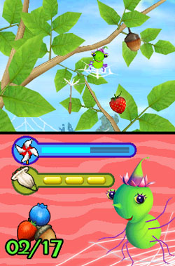 My favorite of all four mini-games is the Shimmer and Wiggle game. Here you don’t control the characters directly, they keep moving left to right as the screen scrolls by. Instead, you have to use the stylus to collect the fruits and get rid of obstacles. To collect a fruit, you draw a circle around it and Shimmer will fly over to pick it and drop it. Wiggle will automatically catch the fruit once he walks by it. To destroy thorns or floating leaves, you tap on them with the stylus.