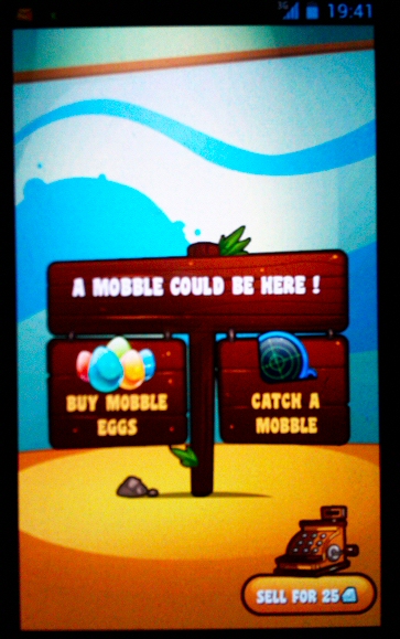 Then, at some point and to my surprise, Mobbles gave me the opportunity to capture a pet. In this screen, a creature appeared bouncing around like crazy, and I had to tap the screen when it stopped, so I could smack it and stun it. Once stunned, I bring down the vacuum (of sorts) and capture the Mobble.