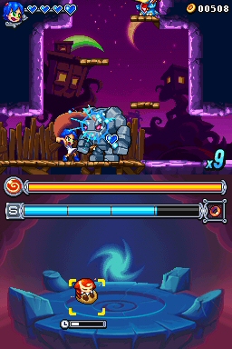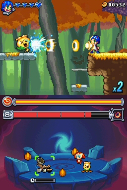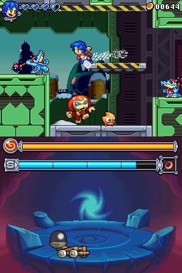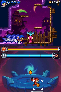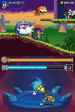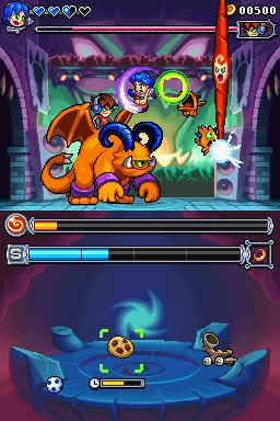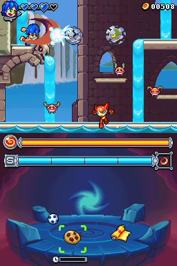 Chomp has about 30 different forms, and each has unique abilities that will help Ellie progress through the Monster World: you can summon him to the top screen and use him a shield or have him reach areas that otherwise you can’t, he can place bombs or attack enemies, even transform into useful objects. Sometimes, enemies will go down to the touch screen and attack Chomp as well. Chomp doesn’t actually die, but he can be knocked out.