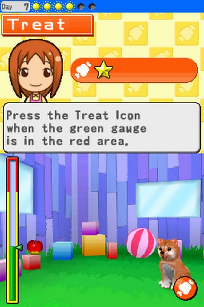 What you do every day is limited by the number of “sunshines” on the top screen. Each sunshine represents one action (such as feeding, bathing, brushing, catching an animal). When all actions for the day have been used, mom lets you know it’s time to sleep, and a new day will begin.