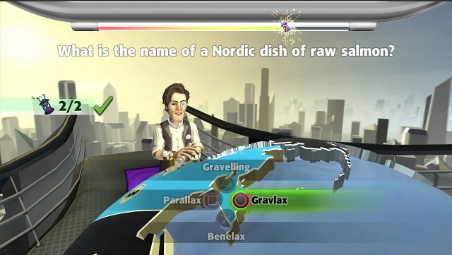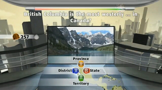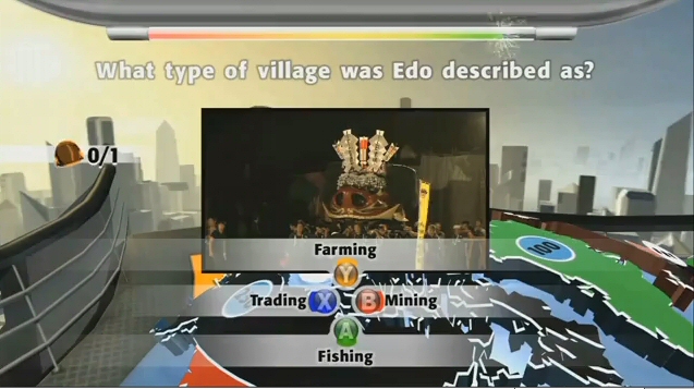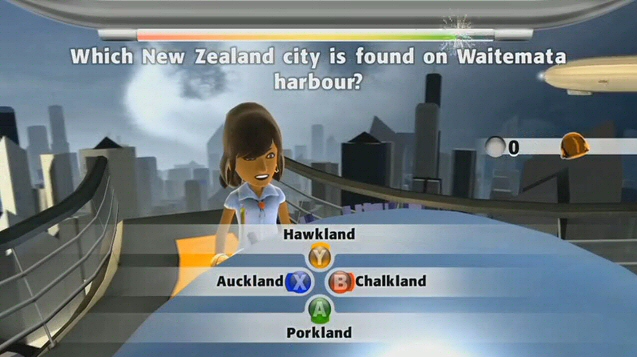 Unfortunately, while the gameplay interface works well, assigning answers to the A, B, X and Y buttons, the entirety of the setup is rather boring. While the gameplay can be compared to You Don’t Know Jack, the announcer isn’t nearly as entertaining, with voice loops that repeat far too often. Furthermore, the video segments are disjointed, causing major slowdown as the game struggles to load them in, while the quality is just as questionable. When being quizzed on New York City for instance, one video may be fairly up-to-date with relevant billboards in Times Square while the next is a blurry and outdated eye sore with images of the World Trade Center (as a testament to its age). Finally, some video segments have absolutely nothing to do with the questions you’re asked. Unless this was deliberate (a way to throw the user off base and make the quizzes harder – which I doubt), it’s a disappointing oversight.