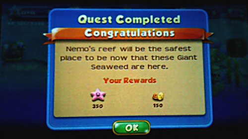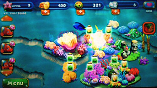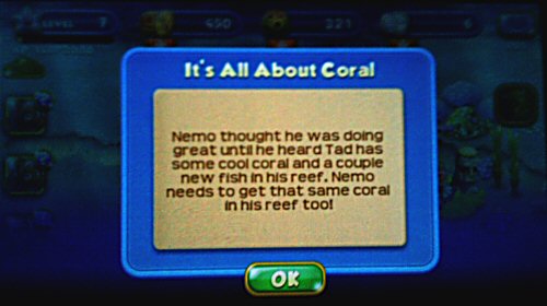 Nemo’s Reef progresses much like social games played on Facebook. Active quests appear on the left side of the screen, and clicking on them shows the requirements to complete it. The two major resources for building your reef are Algae for feeding plants and Sand Dollars to purchase structures. There is an alternative currency system as well, Pearls, which are purchased with real money or by completing offers (such as signing up for services or downloading other apps) and can be used to speed up building or purchasing special things for your reef. Unfortunately, some of the quests actually require Pearls to complete, since certain items that you will need can only be purchased through this currency, which is unfair.