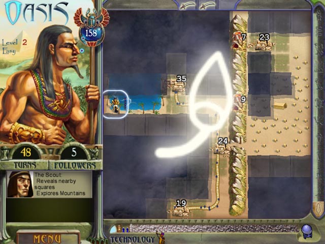 You also have to search for the obelisk, which is basically your last resource weapon against the barbarians if all cities are destroyed. The obelisk is usually located on a lake at the edge of the map. Uncovering the lake tiles will give your staff more power, which means you can kill more barbarians with it. When all cities have been destroyed, if your Scarab Power number is higher than the remaining number of barbarians, then you win and move on to the next level.