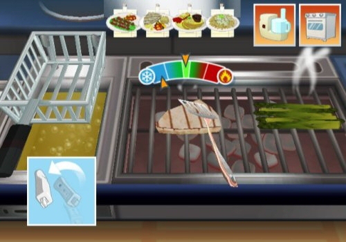 On the cutting board you will be slicing tomatoes, grating cheese, chopping onions, carving meat or preparing lettuce. The motions aren’t always the same though. For grating, you need to shake the remote as fast as you can, there is an indicator for the timer ticking down as the prep time goes from perfect to bad. For slicing and chopping, there will be two yellow lines as your guide, and you have to cut when they move together to form a single line. For the lettuce, you must pull the leaves apart with a yanking motion as quick as possible. For carving, you move the Wii-mote back and forth as if using a large knife, and to be honest, this was probably the toughest task for me since I could never get a good result. Instead, I’d just pass it to an assistant.
