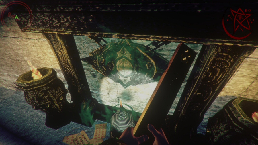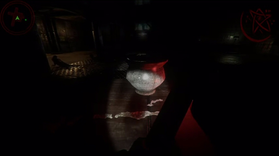While the HUD isn’t all that clear at first, the journal will teach you what is what. Basically, the crescent is your HP bar and the pentagram represents your sanity. Icons in between are what you are carrying in your inventory.