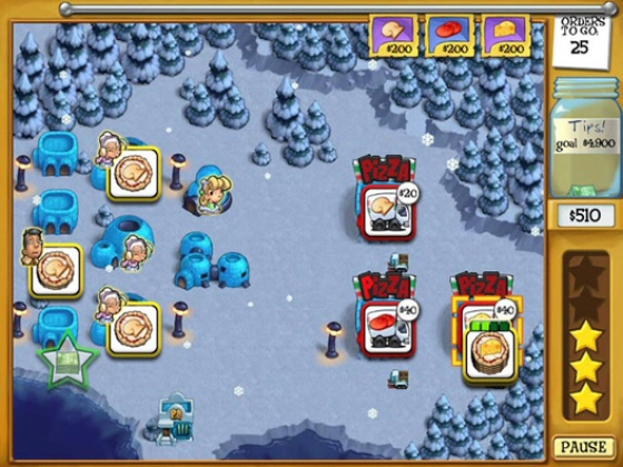 The game features dozens of levels and 12 exotic locations, including tropical islands, beaches, city suburbs and arctic villages, all populated with customers hungry for pizza. At the end of each level, if you haven’t missed any orders, you will get a little bonus: a blimp will float by dropping bags of money.