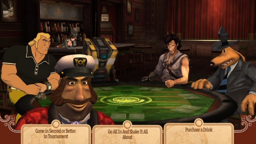Poker Night 2 offers a good number of unlockable goodies. You earn special tokens by winning tournaments, which can then be redeemed by items such as card decks, table felts and chip designs, with the themes related to each of the characters. Alternatively, you can use said tokens to buy rounds of drinks for everyone at the table, and in the process, making it easier for you to tell when they’re bluffing.