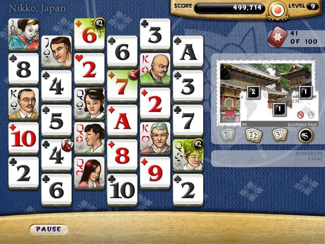 There are three different game modes: Tour, Challenge, and Arcade. You will want to start with Tour mode, to gain familiarity with the game without added time pressure that you will get in Challenge mode. Your world tour starts off in Tokyo, Japan. And there’s a nice helpful screen that shows you how to play the game. Basically your board consists of a bunch of cards, 5 rows and six columns, with every other column staggered. Your objective is to form a poker hand with at least two cards, and up to five cards. The first poker hands you will try to form are a simple “pair” hand where two cards are the same. You can use as little as two and up to five cards to form a “pair.” On the right side of the screen you’ll see something that looks like a boarding ticket, and a number at the top of the ticket that represents how many “pair” hands you need to make to advance to the next city. As you make the hands, the number will move down, as well as reveal a cute postcard behind the boarding ticket. Also when you make hands, the cards shift down and new ones appear from the top to fill the board again. When you have completed the required number of hands, the postcard will be revealed as well as a paragraph with fun facts about the city.