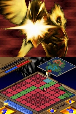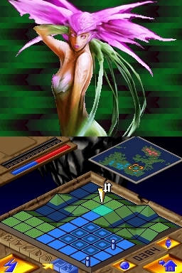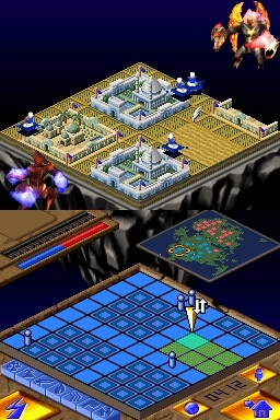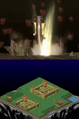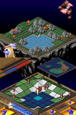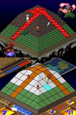 Gameplay is actually a lot simpler than the description of its gameplay may let on. The top screen presents a pixilated view of the continent within each level, with your worshipers being presented in one color, while your enemies are another. The touch screen contains a grid-layout view of the same section of the continent, minus the actual buildings, trees, rocks, etc. that can be seen on the top screen. Instead, rocks are represented on the touch screen as white squares, lava as orange squares, etc., while villagers are small dots, allowing the bottom screen to remain as uncluttered as possible.