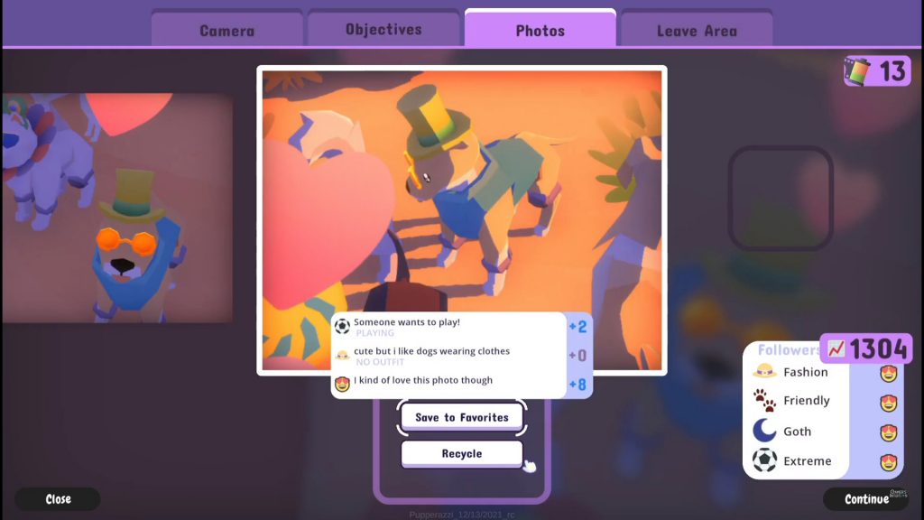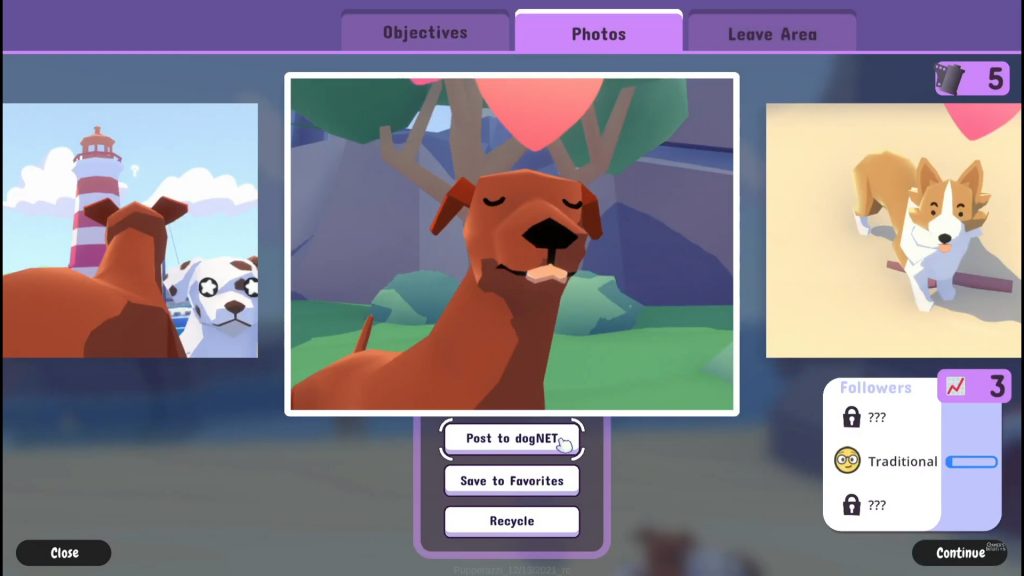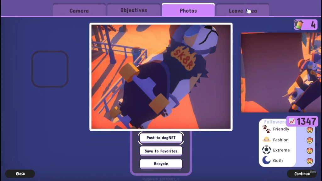 As you snap photos, you can save them to your gallery, mark them as favorites and, most importantly, share them on dogNET to gain a follower base. It was this same social media aspect that initially nearly turned me off the game, but I understand its purpose. When uploading to dogNET, you will notice your photos will appeal to particular groups depending on content: traditional, goth, friendly, extreme, fashion and so on. However, there is a limit to how many photos you can upload per day to gain followers, and any extra will be considered spam. You won’t be penalized nor will you lose followers, but you will see some comments about spamming, so try to upload your best photos. You can “recycle” what you don’t want to use (deletes the photo) and are able to save your favorite photos. Since I played through Xbox Game Pass on PC, those I marked as favorites were saved to my computer.