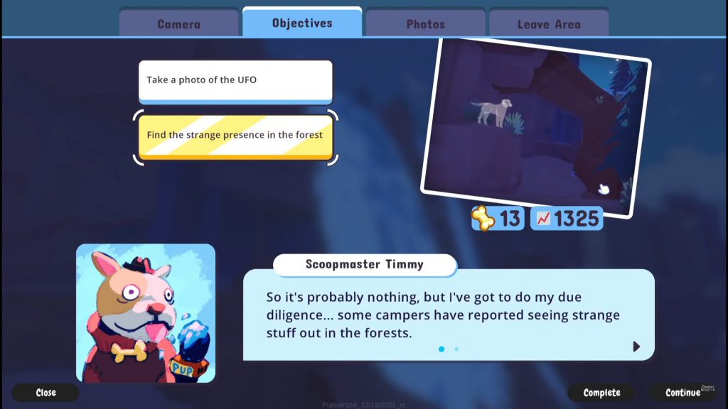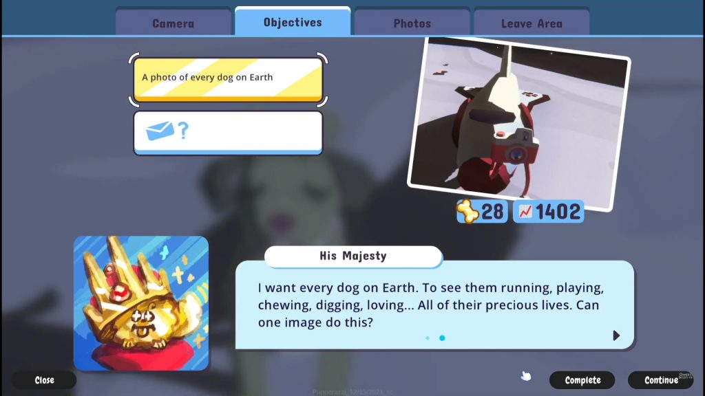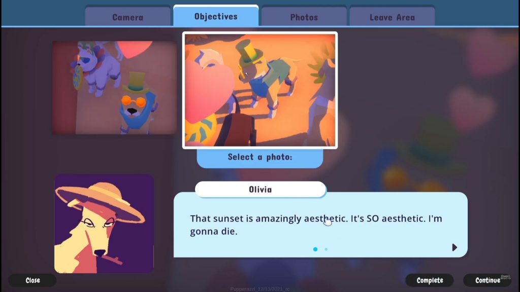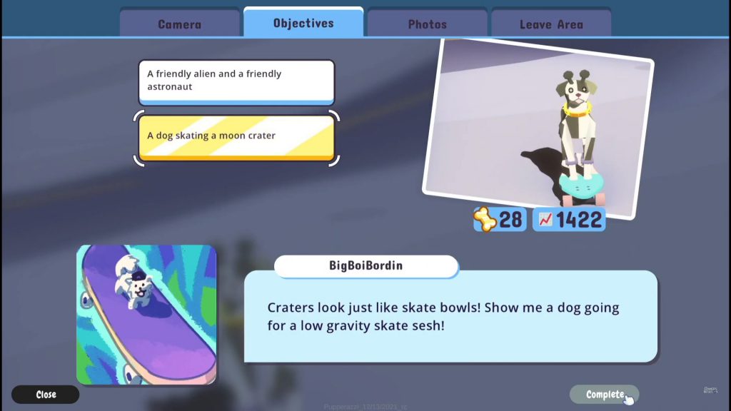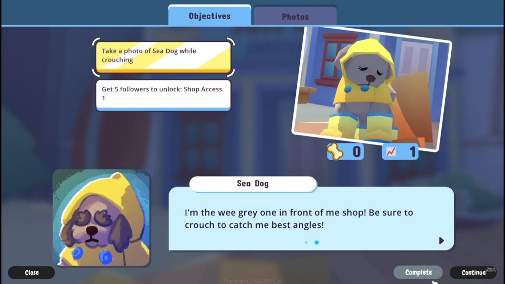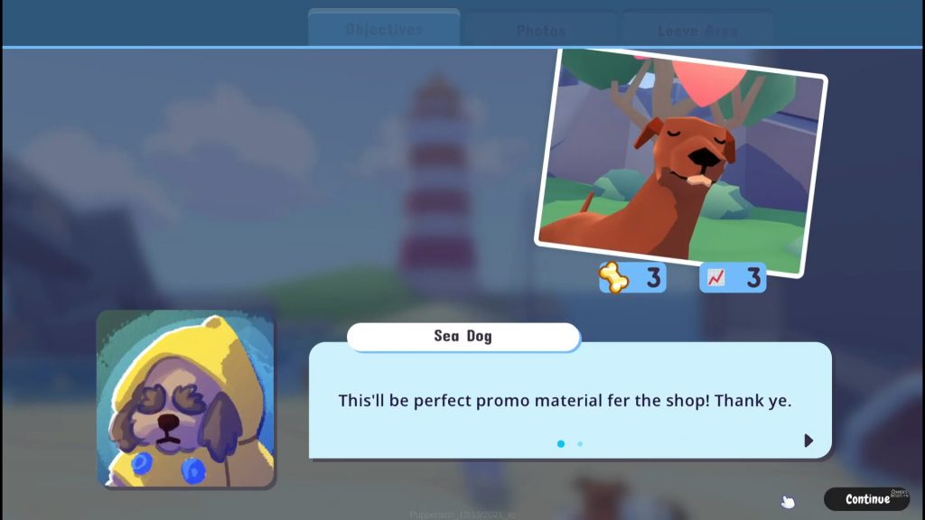 Most objectives are little quests that require you to snap a particular photo. This can be anything ranging from a dog doing a certain type of activity (ex: fetching a stick), wearing a particular clothing item or accessory, a dog in a certain scenario, or photographing a dog at a certain angle or time of day. A few others include a variety of tasks revolving around exploration, such as cleaning up the skate park or re-opening an old arcade.