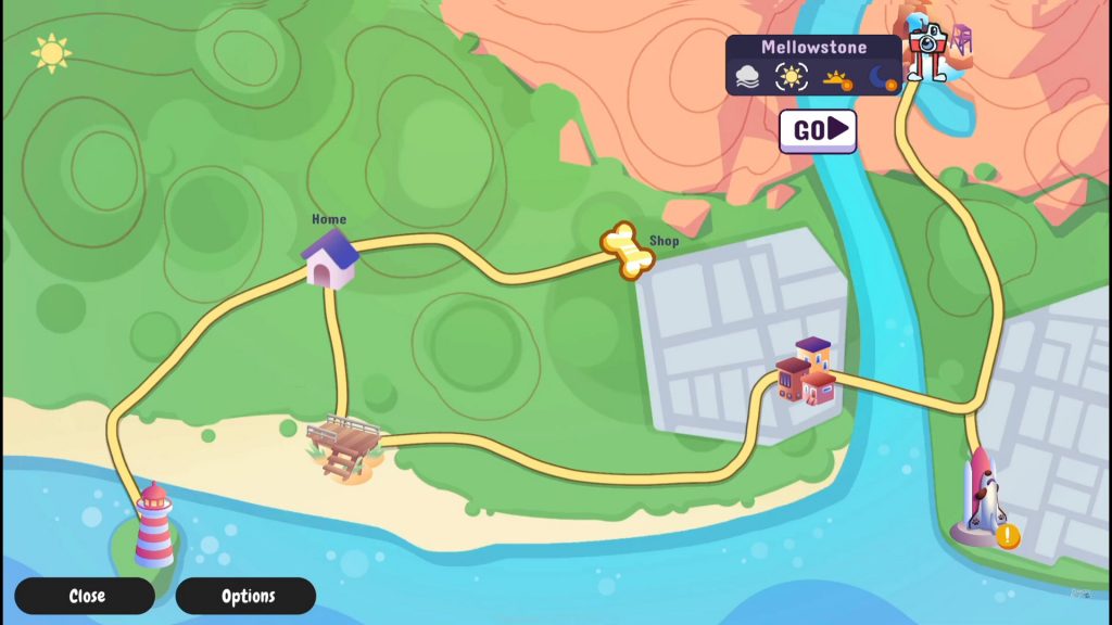 You play as a camera. No, not a photographer, you ARE the camera. A camera with arms and legs, who walks around and pets the doggies to befriend them. The town map offers five locations to explore at different times of day, and a final bonus location. Lighthouse Cove, Buppy Boardwalk, Muttropolis, and Mellowstone can be visited during morning, afternoon, evening and night. Progression and unlocking the different areas and times is done by completing objectives in the available areas and times of day.