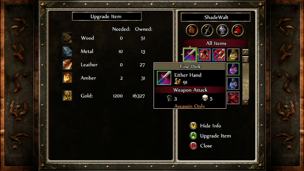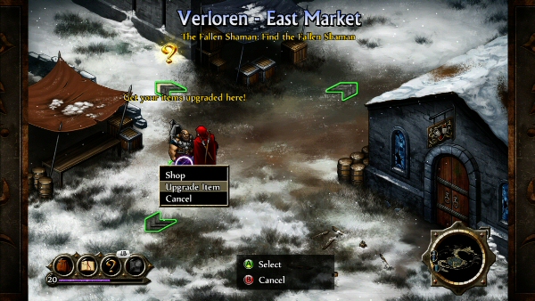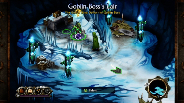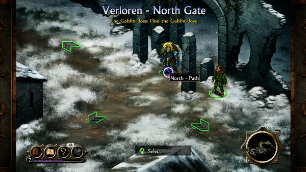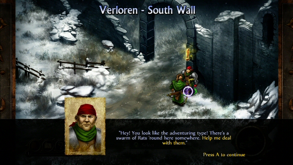 Your adventure begins in the town of Verloren, where people have been disappearing in the middle of the night. You arrive just in time, as the town is being invaded by goblins. No longer moving in a world map from location to location, we now enter towns and dungeons and travel through their different areas, which are presented in an isometric view. We can talk to villagers, receive quests, purchase armor or sell goods by going a little beyond character portraits and text. It’s interesting to see the different environments and how they fit in the story, and each area has its own map, which you can access by pressing RB. You can check your position on the area map and check which areas you have been through (they will be colored) or see where quests are located. There is also a guide trail that tells you where to go, so you can’t really get lost. Follow the golden question mark to the next part of the main quest, or explore everything and get the most out of your adventure.