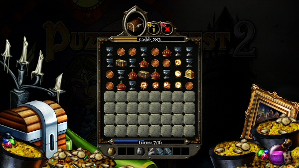 Looting can be the most rewarding of the mini-games, and sometimes the most frustrating too. As you match coins, cups and crows, you accumulate gold. If you match 4 of a kind, you get a common chest. If you match 5 of a kind, you get a rare chest. Matching common chests gives you items and materials, while matching fine chests gets you rare items. There is a limited number of moves and the puzzle field will get smaller every other move, adding blocks to the bottom row and removing whatever gems there were in that row. It’s my favorite mini-game. Well, maybe up there with bashing doors…