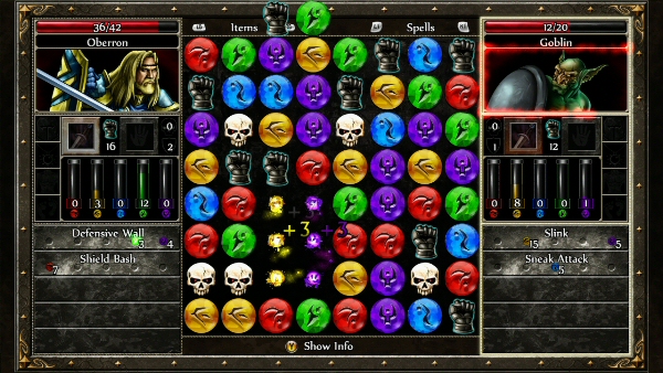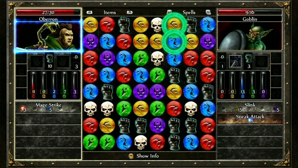 Fighting is still the main portion of Puzzle Quest 2. Encounters are interesting, since now you have a few different features to use. First, there are no gold or experience gems anymore. Skulls and five mana colors are still there. Skulls will do direct damage, mana will accumulate so you can use your spells and skills. But now we also have action gems (the black gauntlets), which give you AP (action points) allowing you to use your equipped weapon to do direct damage.