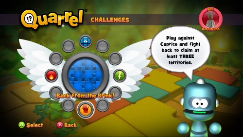 There are three single-player game modes available, Domination, Showdown and Challenge. Domination is a progressive series of matches that place you against one to four adversaries of increasing difficulty, in an effort to control all the Quarrel islands. Showdown places you against all adversaries in a series of one-on-one matches. Challenge offers some twists on the basic mechanics, focusing on a single task, such as conquering the island while initially owning a single territory, surrounded by three enemies, or taking a prisoner from each opposing faction. All modes grade you with Bronze, Silver and Gold medals depending on your performance.