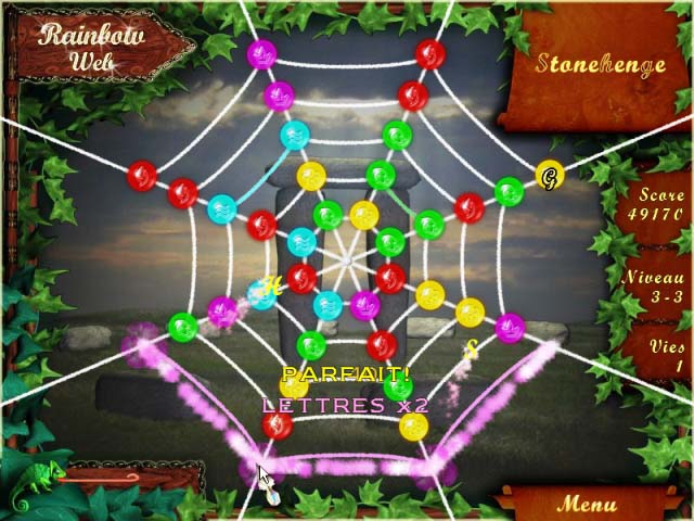 The game is composed of 60 challenging levels, where you must swap adjacent gems around to create combinations of three or more of the same color, horizontally or vertically. The ultimate purpose in each puzzle is to uncover the words that create the name of the scene. To uncover the name you need to create color combos that include the gems with the letters. A color combo will burst and add points to your score, leaving room for more gems to emerge from the center of the web, pushing the existing gems towards the edge of it.