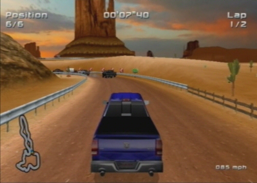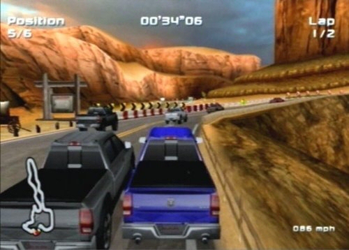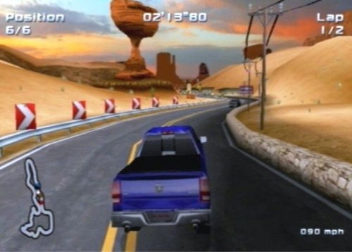 That being said, there’s no penalty for wrecking, and therefore no reason to avoid slamming into your opponents to make a move. You can bounce off of a wall and keep going, all the while taking no damage to your limited selection of vehicles. In the game’s competition mode, each truck is faster than the last, but all handle in the same manor, with incredibly sensitive controls. Holding the WiiMote horizontally, it’s far too easy to send your truck careening into a wall by over-tilting the controller, and then even easier to overcorrect and end up on two wheels or worse, while your cheap AI opponents go racing by (if nothing else, you’ll frequently find yourself spun out by the computer racers only to never be able to catch up).