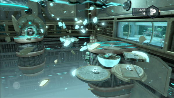 After solving a few of these puzzles, you’ll find yourself repairing time on planets via a timed mini-game that has you aiming your crosshair at floating representations of each planet, and sealing moving rifts on the surface. Power-ups allow you to seal a rift faster, or impact a wider area, while other entities try to undo your progress. Afterwards, you interact with more time pad puzzles as you further explore the Clock and learn of Clank’s past.