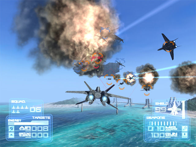 Things to glance at even during the most frenetic battles are the ones that could mean you start the mission all over again. Your shields or your health displays in the right hand corner out of 99 points. The shields replenish after delivering opponents to a fiery, flaming death. If your shields get too low then you’re the one crispy fried. In the bottom left hand corner is a count of how many enemies you’ve destroyed and how many wingmen remain. Unfortunately, though they’re about as useful as a bucket of water in front of a forest fire, the wingmen count is very important. The mission’s success can depend on whether you can keep at least one of your team alive.