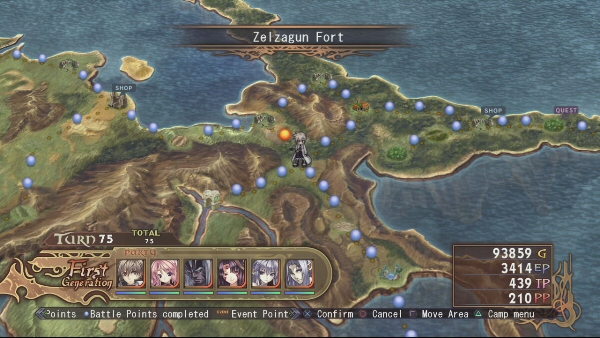 Progression is done on the world map, which is divided into paths with circles along them. Each circle is a battle, a town or a free-roaming environment. For the battle spots, you enter them right away. You can adjust your equipment and set party members position on the field before you begin the battle. You won’t be able to progress to the next “circle” until you clear the previous battle.