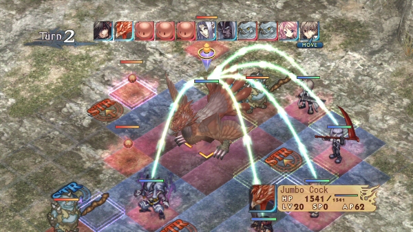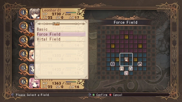 The combat system is turn-based. Similar to Shining Force and Final Fantasy Tactics, you move your characters on a grid. Like in Jeanne D’Arc, in the first phase you pick where to move each one, and then you attack on the second phase. But what makes what would be simple combat turns pretty complex when you add a system that can link characters together. Each character has “extended areas” which allow them to link themselves to another character. You will see this on the battlefield as green lines connecting said characters.