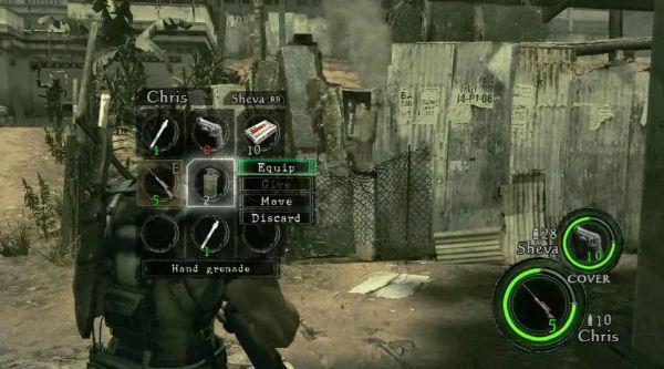 Both Chris and Sheva have separate inventories, which you can manage. The inventories can hold up to 9 items each, with four of them able to be bound to the D-pad for quick access. You can even swap items between the characters, and so you should, since Sheva seems to ignore the ammo conservation concept, and likes to heal you and herself a bit too often. But for the most part, the girl is pretty smart! Friendly fire won’t hurt her, so you don’t have to worry about shooting her if she gets in your way, which doesn’t happen often. Sheva will even go about on her own (but not too far) looking for breakable objects such as crates, or piles of fruit, which may contain useful hidden items like ammo, healing herbs or weapons.